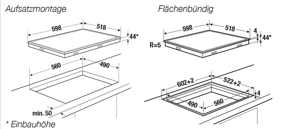 - Ausschnittmaß Breite x Tiefe in mm: 560 x 490