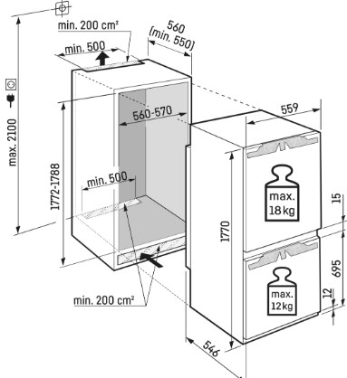 - Gerätemaße H / B / T in cm: 177 / 55,9 / 54,6