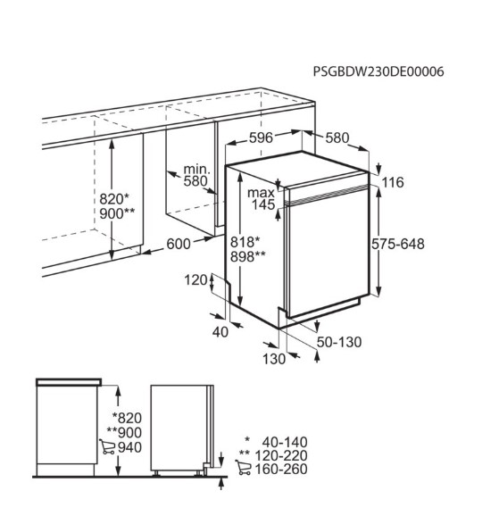 - Einbaumaße H / B / T in mm: 820-900 / 600 / 570