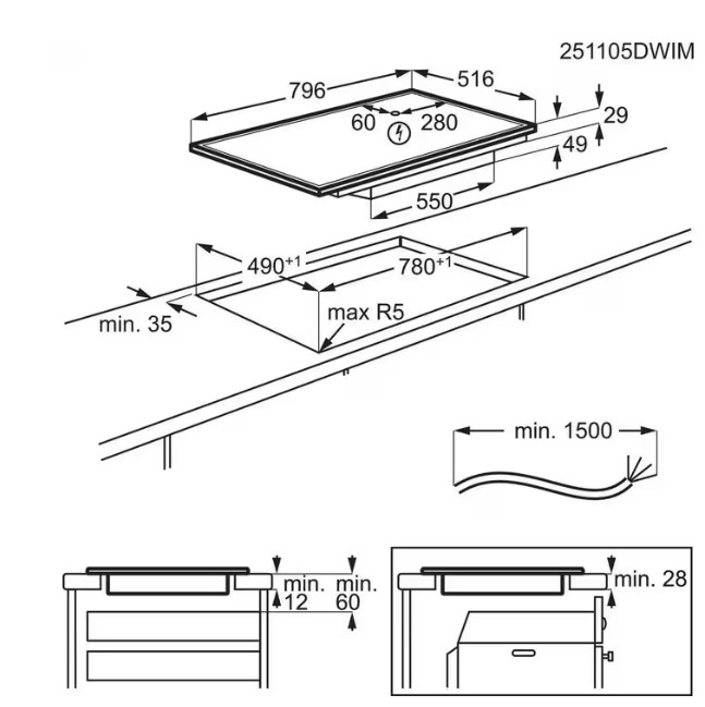 - Ausschnittmaß Breite x Tiefe in mm: 780 x 490
