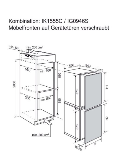 - Nischenmaße H / B / T in mm.: 880 / 560 / 550