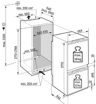 - Gerätemaße H / B / T in cm: 177 / 55,9 / 54,6