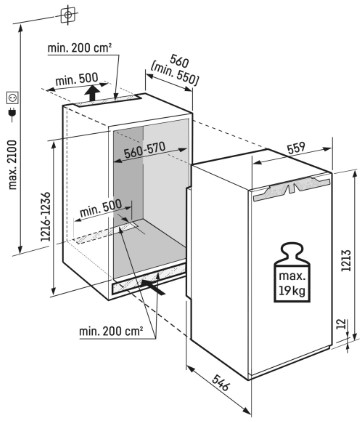 Nischenmaß H / B / T in cm: 121,6 – 123,6 / 56 – 57 / 55