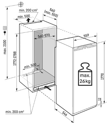 Gerätemaße H / B / T in cm: 177 / 55,9 / 54,6