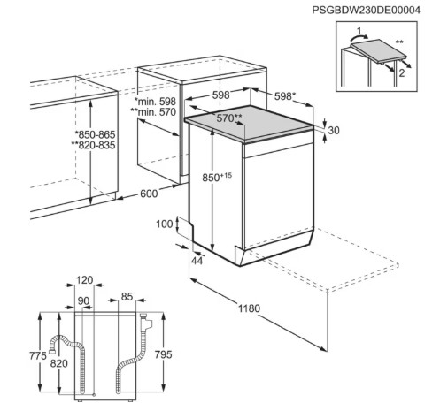 - Gerätemaße H / B / T in mm.: 850 / 598 / 603