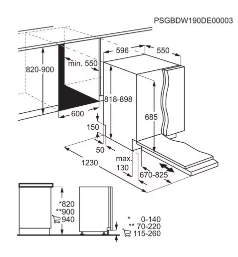 - Einbaumaße H / B / T in mm: 820-900 / 600 / 550