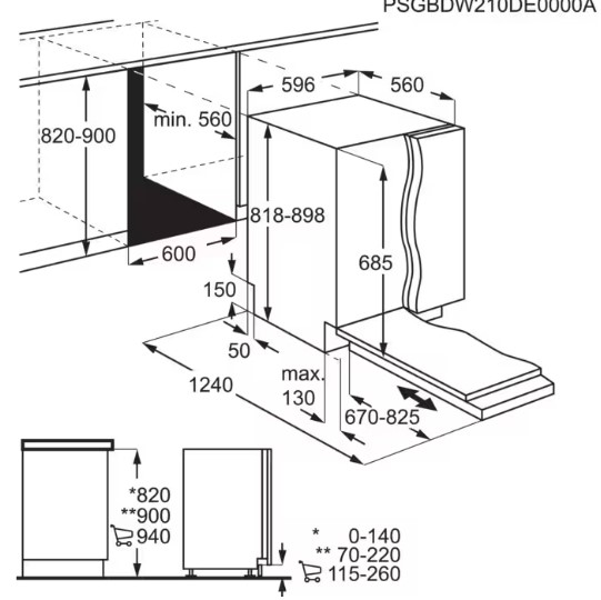 - Einbaumaße H / B / T in mm: 820-900 / 600 / 560